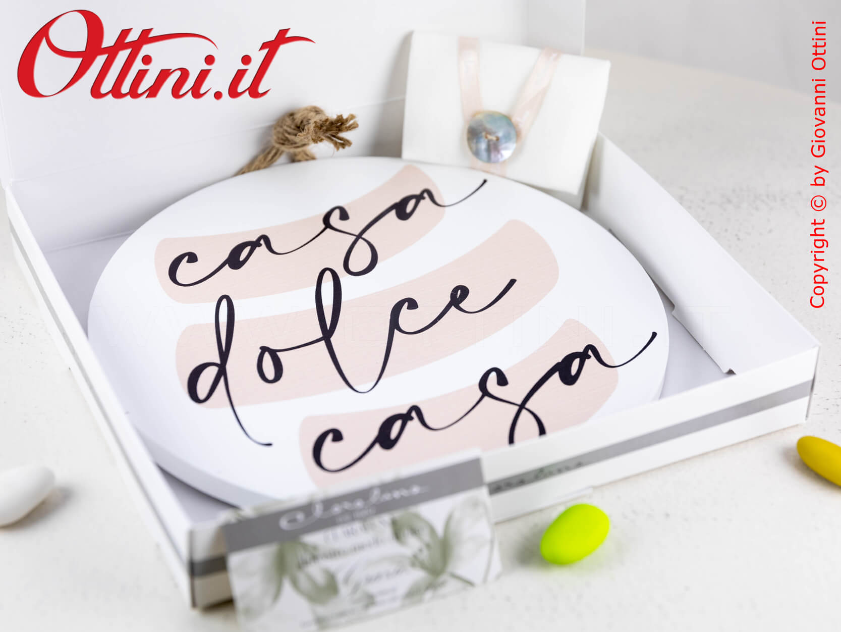 Decoro per porta appendibile realizzato in legno con la frase “Casa dolce casa”.