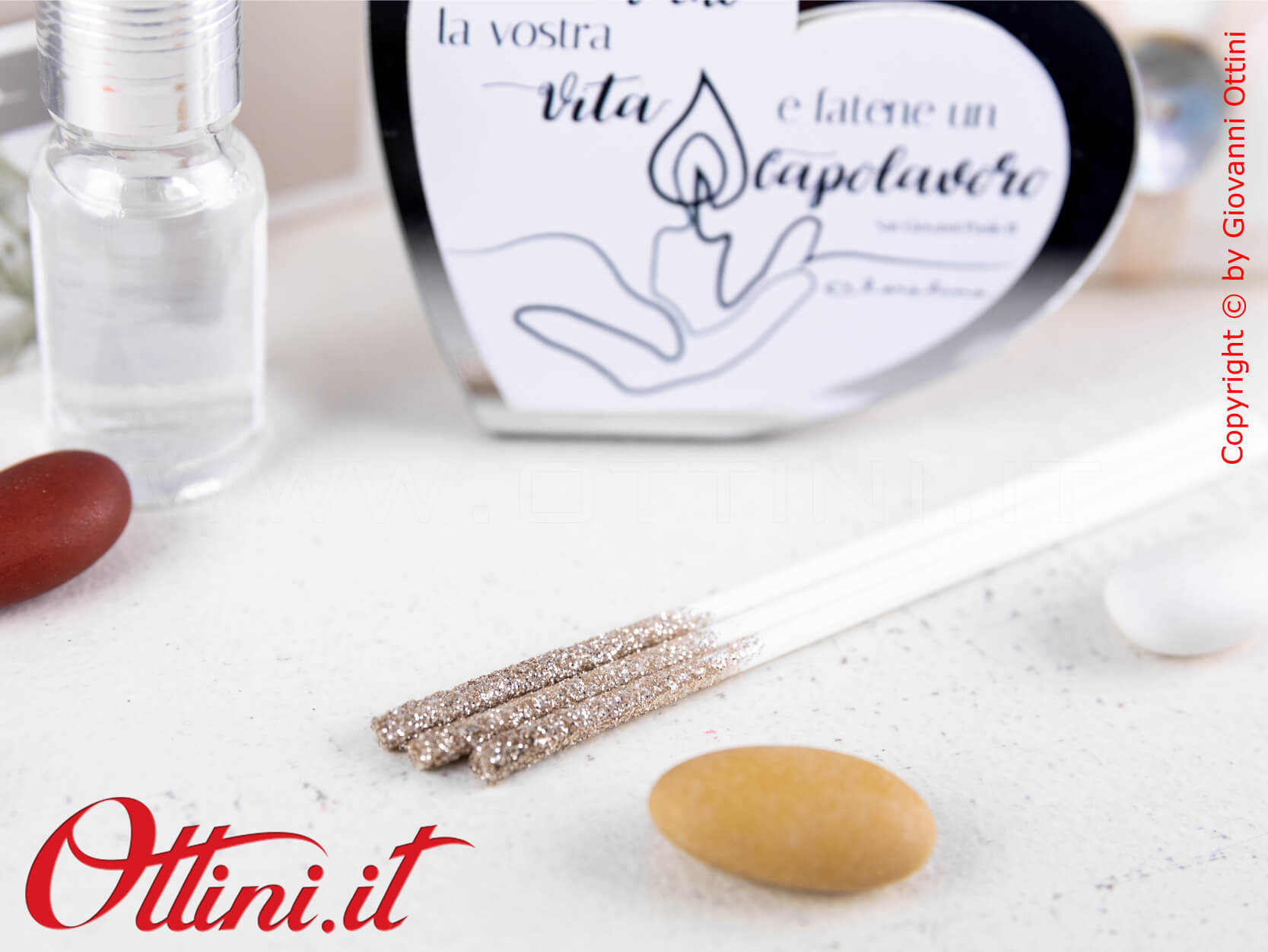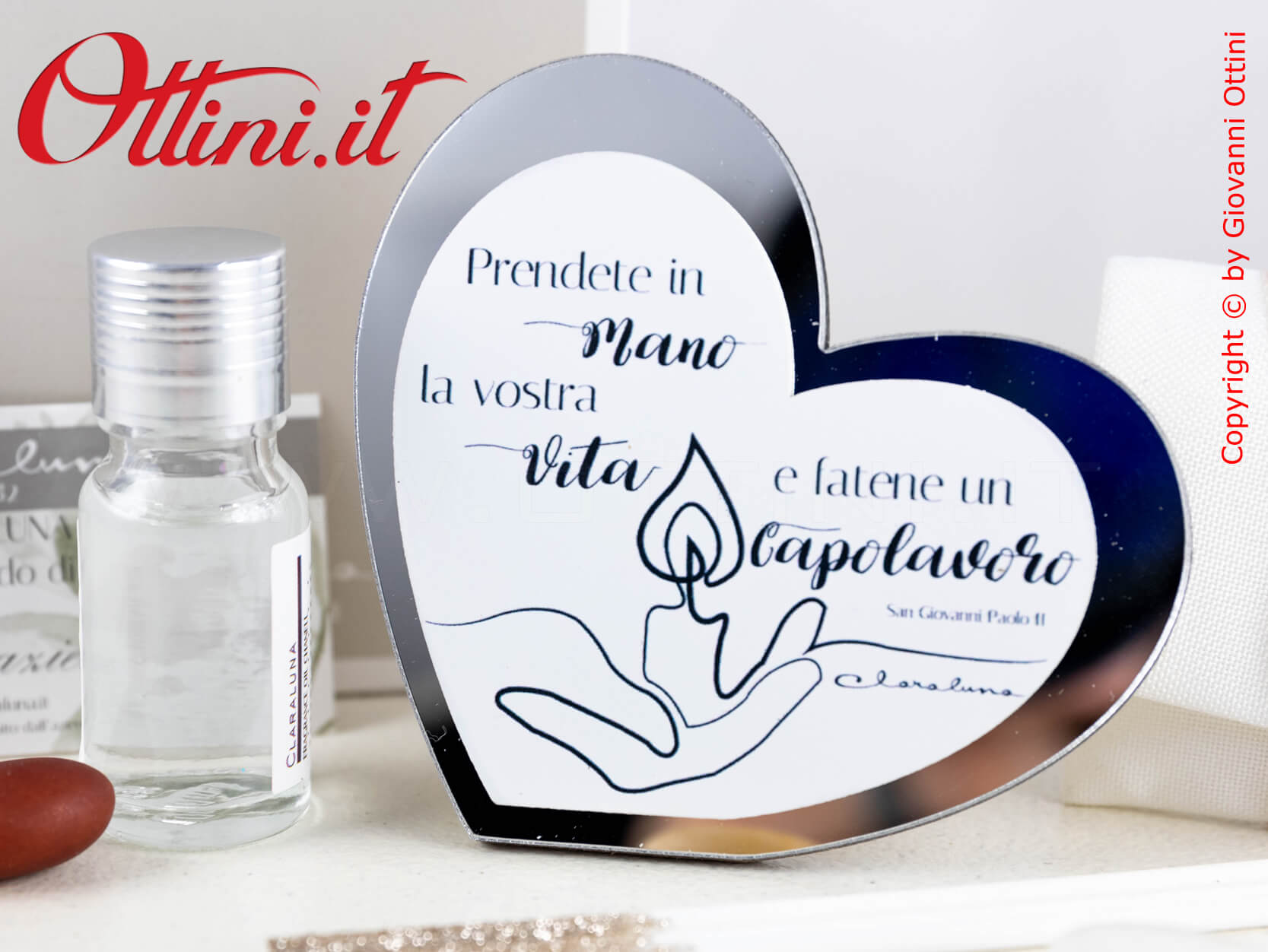 Elegante profumatore a forma di cuore realizzato su base acrilica a specchio. Sulla parte anteriore troviamo una frase di Giovanni Paolo II: “Prendete in mano la vostra vita e fatene un capolavoro”. Indicata per ogni ricorrenza, ma per noi è molto più significativa per un matrimonio in cui la creazione di una famiglia è il “capolavoro” per eccellenza. Questo profumatore è completo del kit essenza, composto dai bastoncini diffusori glitterati e il flaconcino con il profumo.