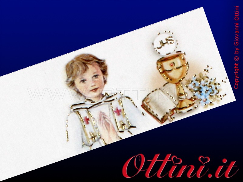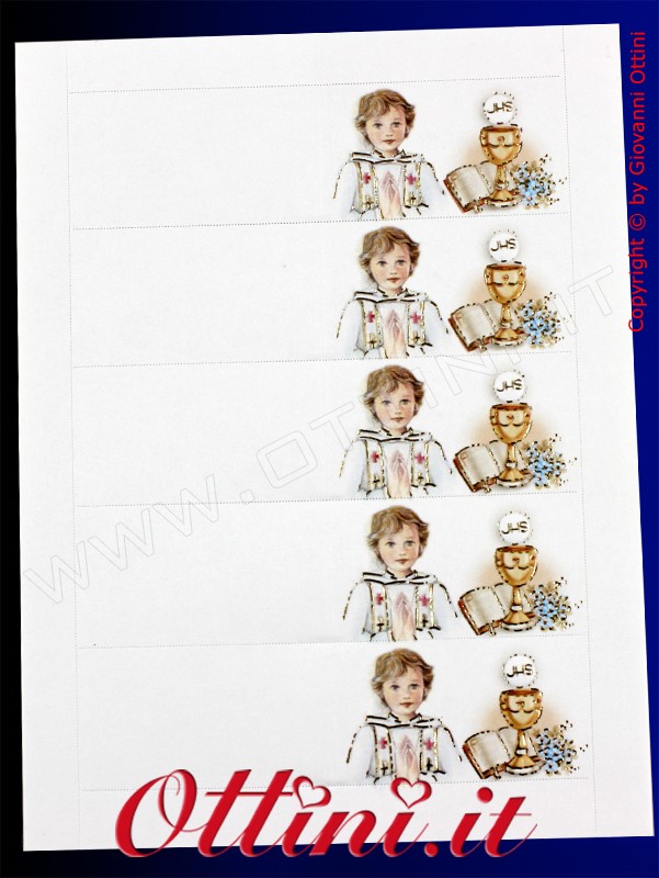 Nuovo bigliettino Bomboniera bambino per prima comunione dalla grafica molto curata ed elegante. I ricchi dettagli in oro a caldo lucido, conferiscono pregio e finezza a tutto l’insieme.