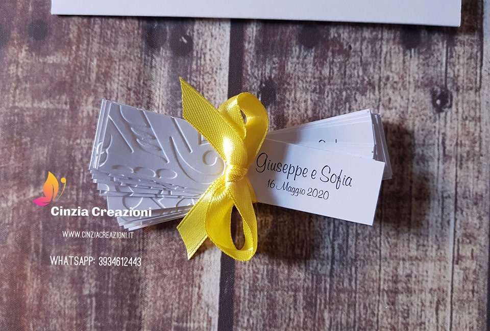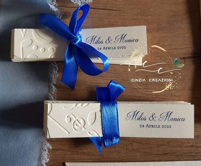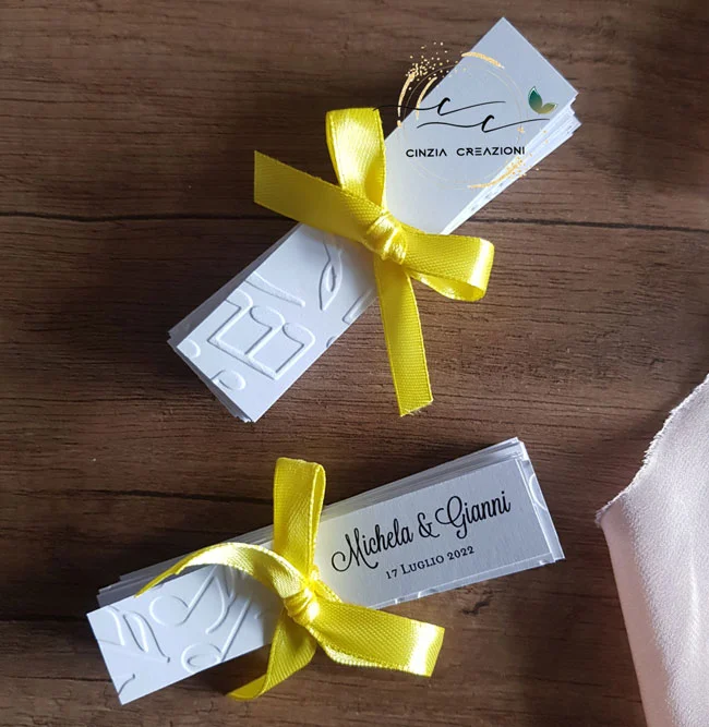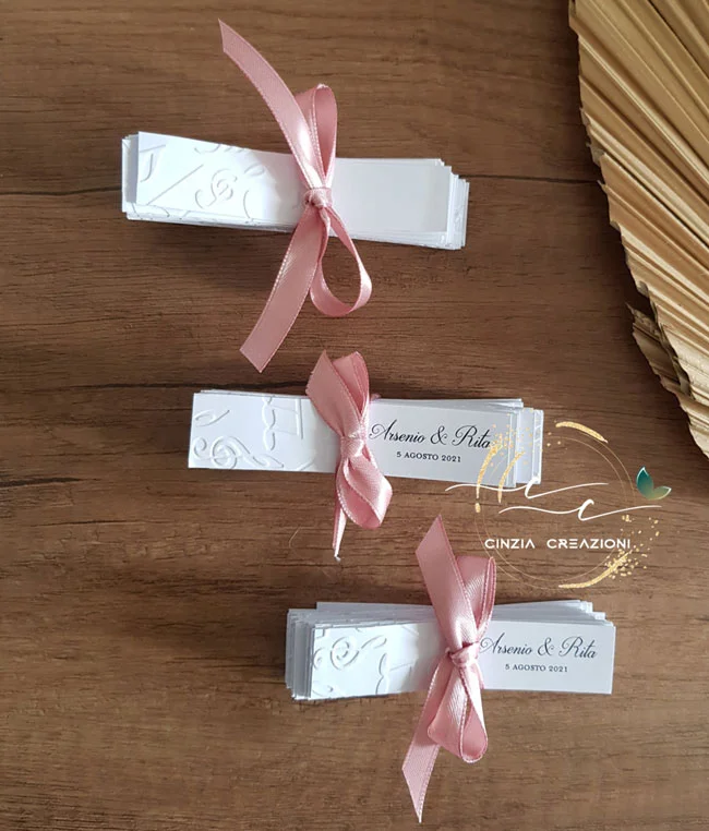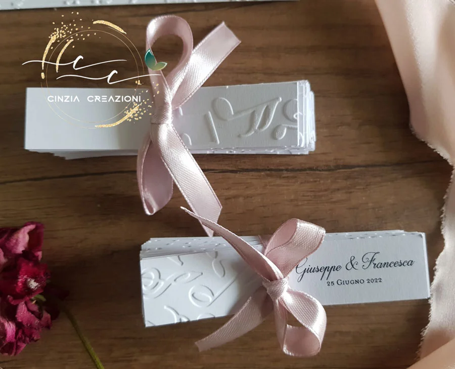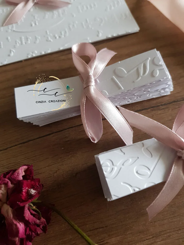 I bigliettini bomboniera possono essere realizzati in cartoncino bianco o avorio da 200 grammi, oppure cartoncino perlato da 250 grammi.