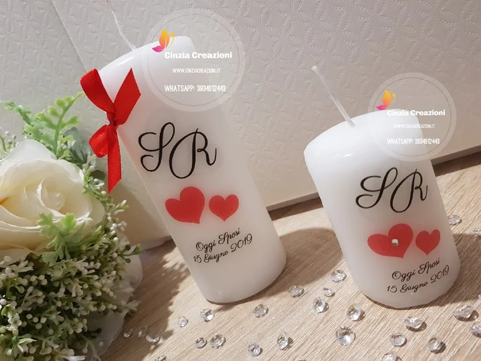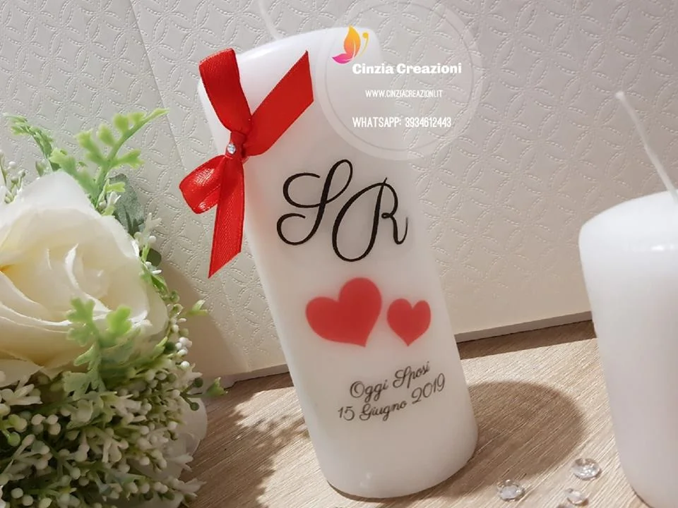 Possibilità di acquistarla completa di confezionamento con candela inserita all’interno di una scatola, sacchetto portaconfetti in toulle con 5 confetti bianchi al cioccolato e bigliettino bomboniera personalizzato.