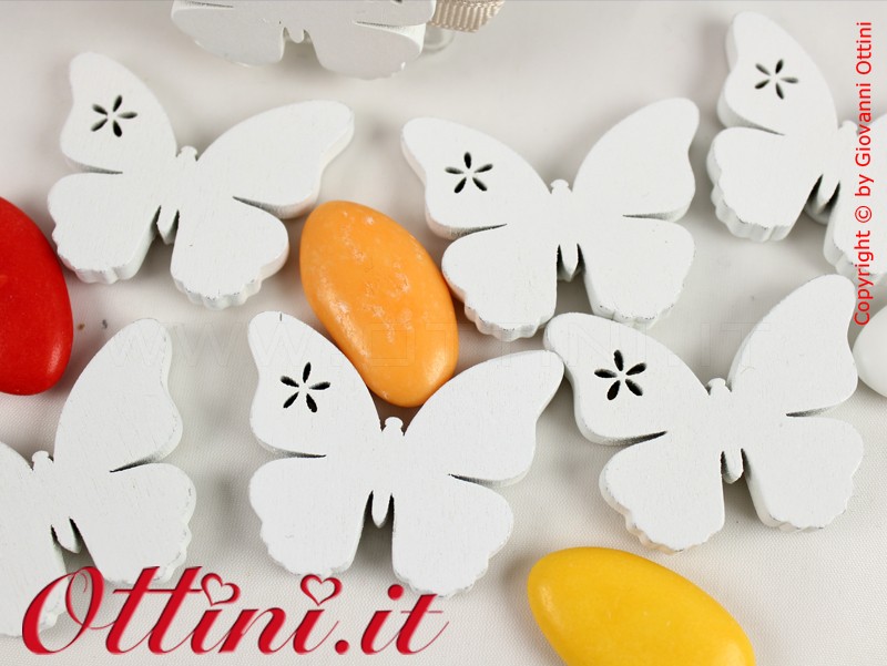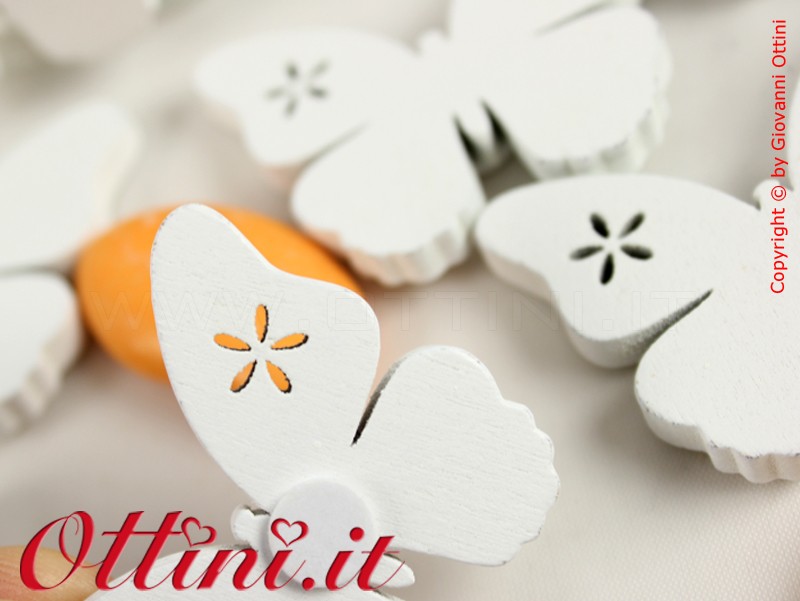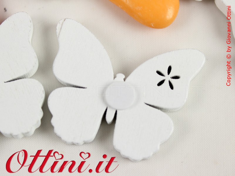 Farfalle in legno dipinte in bianco complete di sticker biadesivo sul retro per una veloce e perfetta applicazione. Questo prodotto ha una lavorazione particolarmente curata e una particolarità accattivante: un fiorellino forato sull’ala destra. E’ un particolare molto fine che da quel tocco in più.