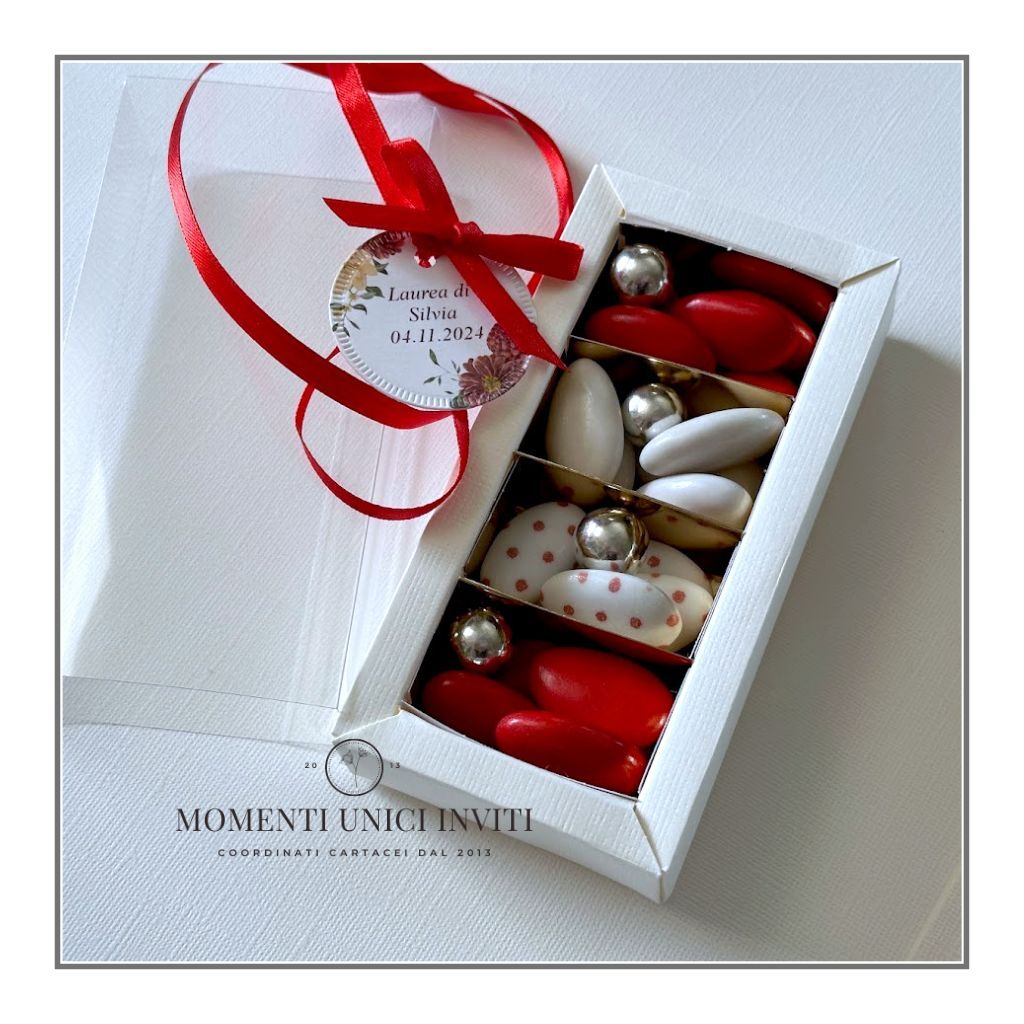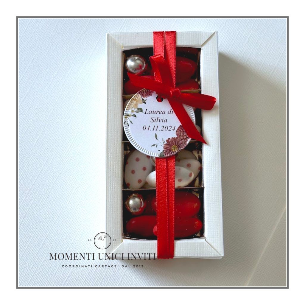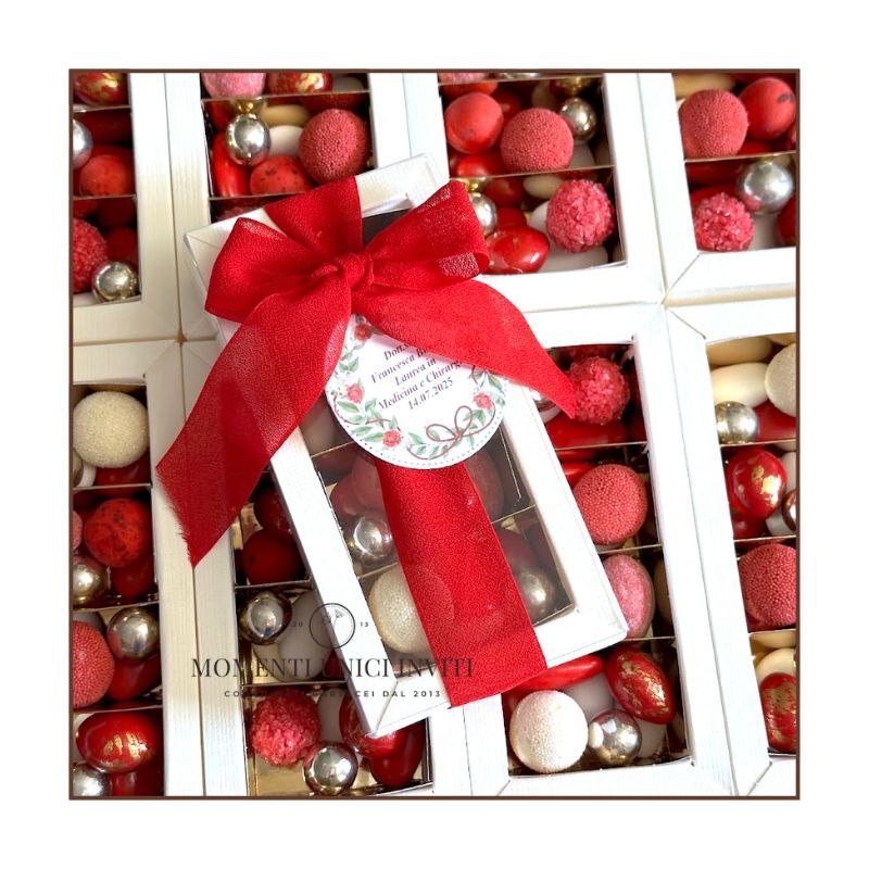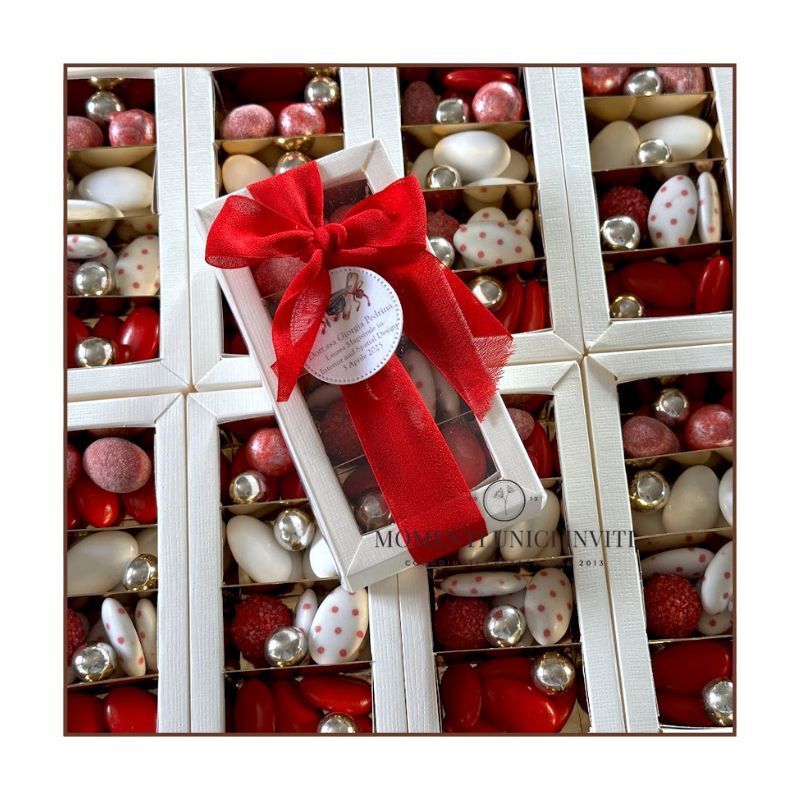 - Contenuto: almeno 20 confetti gusti mix (ton. rosso e bianco con sfere argento)