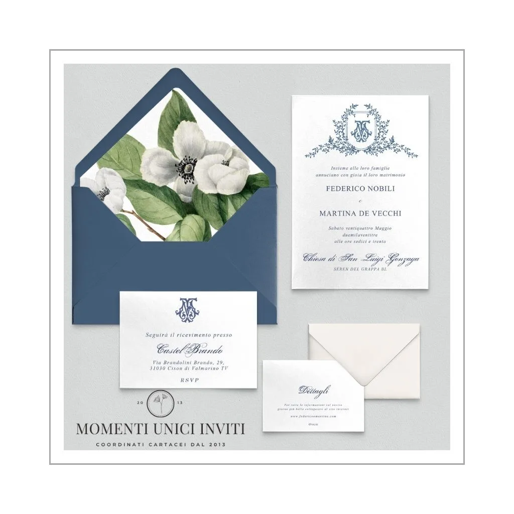 Uno studio attento degli elementi grafici abbinato a una selezione accurata delle perfette tonalità di colore delle buste rende questa nuova collezione ricercata e preziosa. Le partecipazioni saranno il primo elemento che parlerà di voi e del vostro giorno più bello: dallo stile e dall’accuratezza degli inviti, infatti, i vostri ospiti inizieranno già ad entrare nel mood delle vostre nozze.