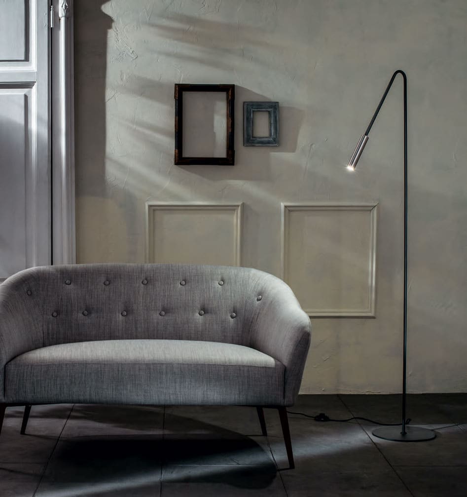 Lampada da terra LED com paralume a tubo in metallo nichelato, base e struttura in metallo verniciato, Cavo telato nero con interruttore a pedale e Luce LED 4W (3000 Kelvin) inclusa.