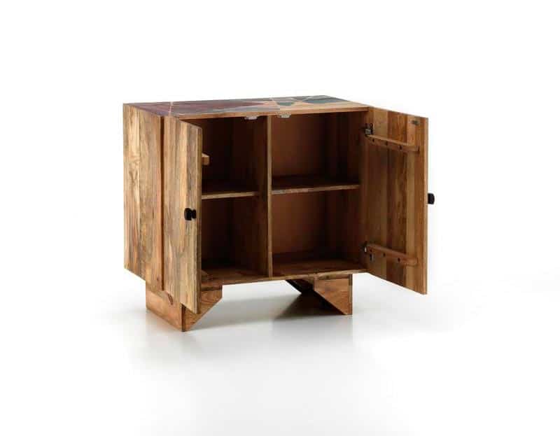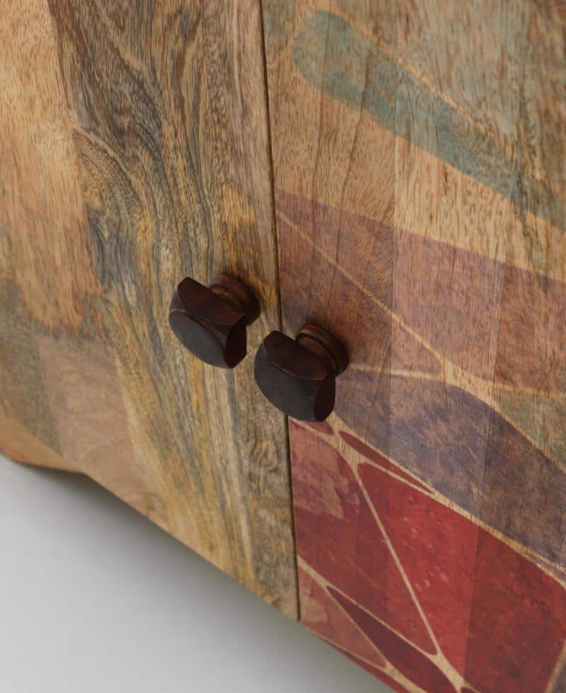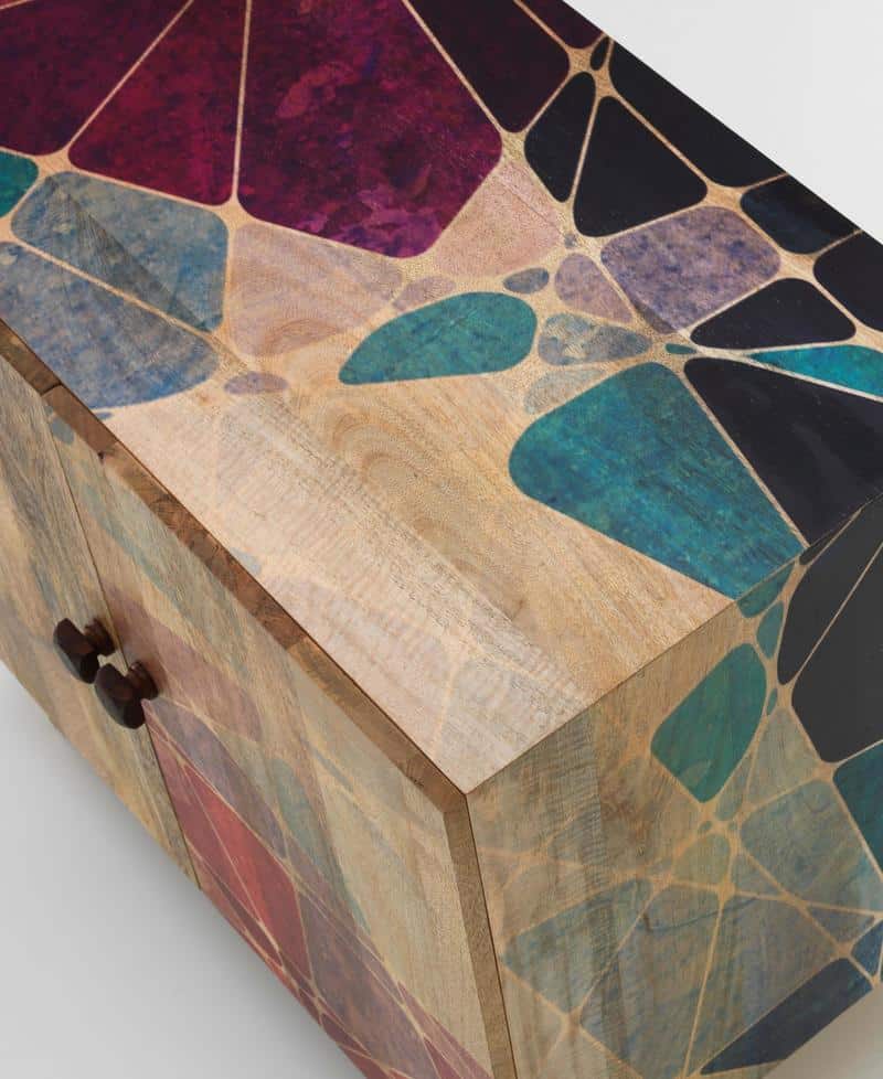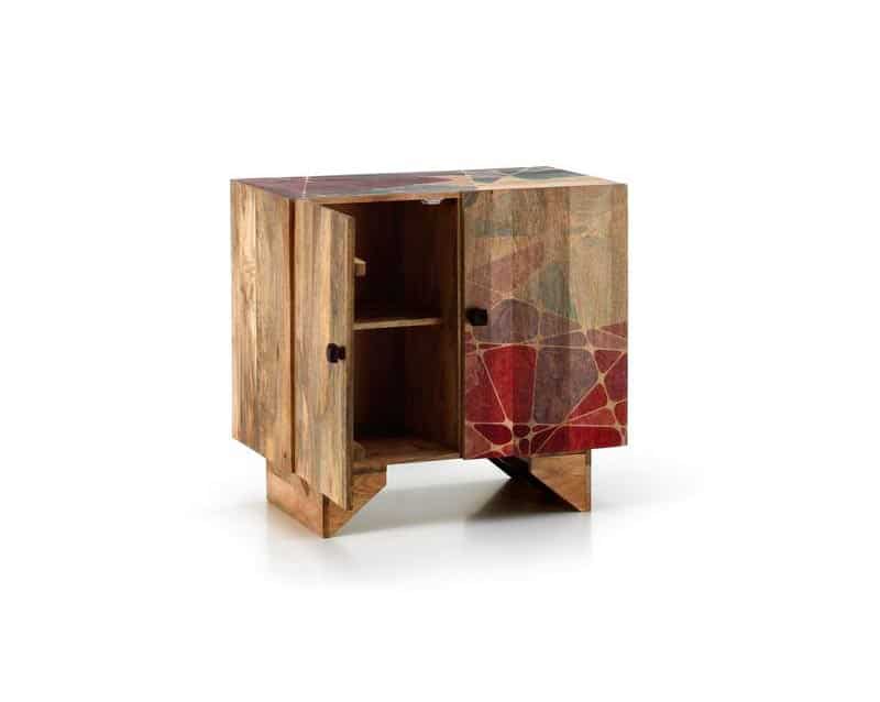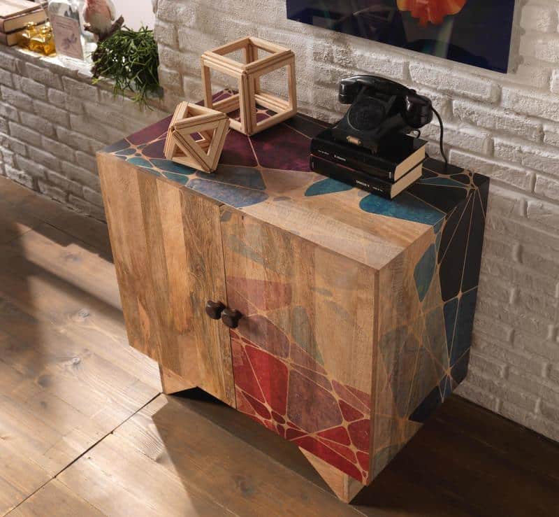 - Il mobile è realizzato in legno massello con una finitura geometrica multicolore
