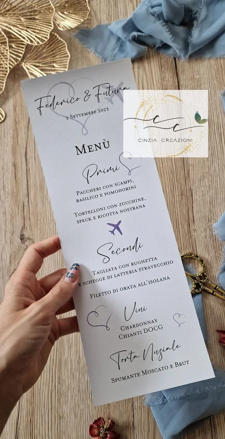 Materiale e misure del menu ristorante matrimonio tema viaggio