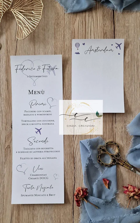 Menu ristorante matrimonio tema viaggio con grafica a tema personalizzabile, nome degli sposi stampati e data dell’evento.