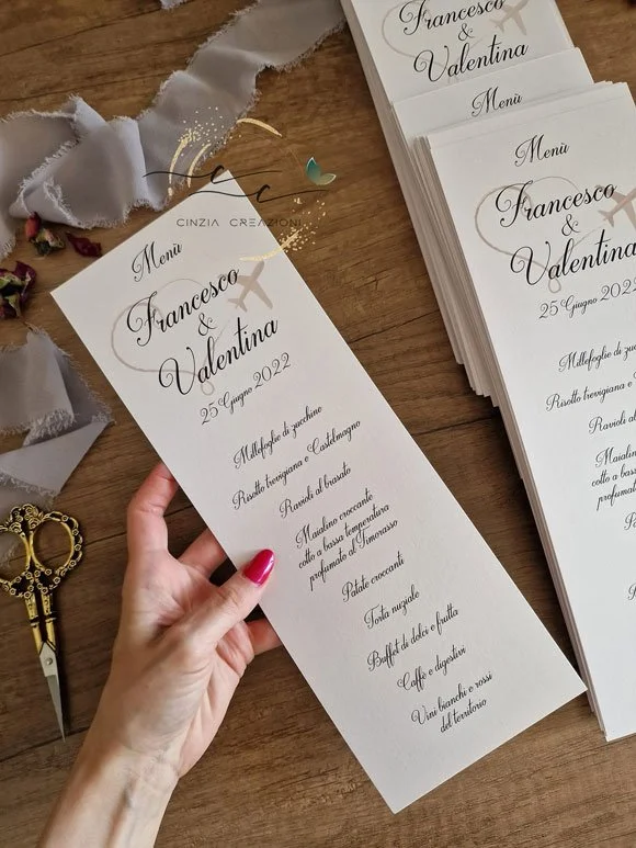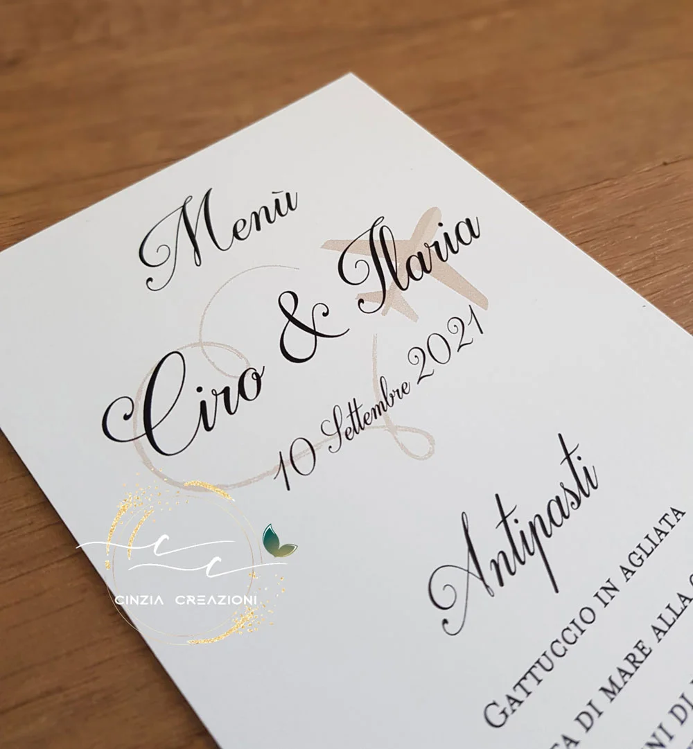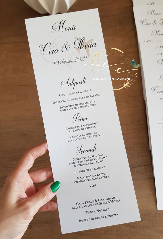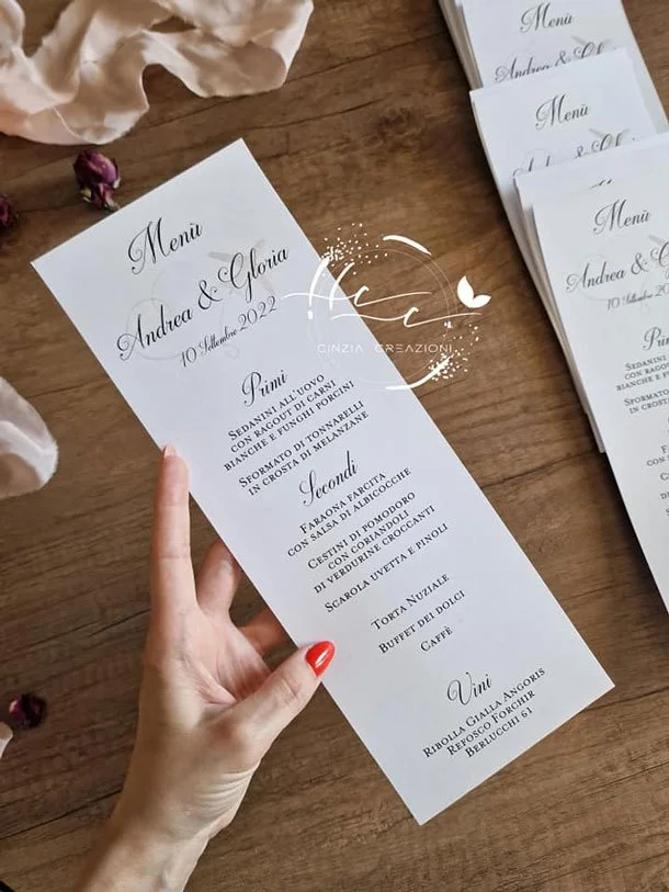 Il menu può essere realizzato in cartoncino liscio bianco da 250 grammi, avorio da 200 grammi oppure in carta perlata bianca da 240 grammi.