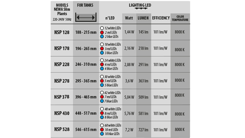 Grazie ai LED di ultima generazione, ogni barra della gamma NEWA SLIM sviluppa un notevole flusso luminoso con un bassissimo consumo energetico, per un’efficienza luminosa di oltre 101 lm/W (luce bianca).