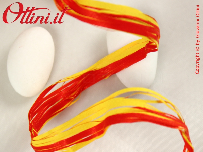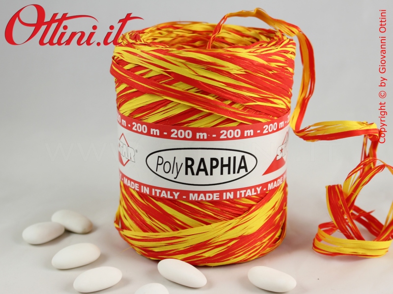 Bobina da 200 metri di Poly Raphia con colori vivaci rosso e giallo, estremamente resistente. La larghezza della sezione stesa è di 15 millimetri. Ideale per decorare e confezionare sacchetti, scatole, bottiglie e tutti quei prodotti a cui si vuole conferire una coreografia vivace e in stile naturale.