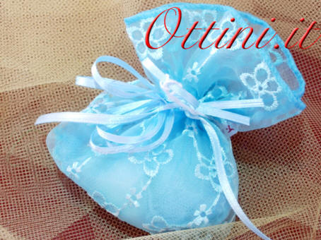 Sacchettino in finissima organza ricamata colore azzurro, con nastrini in doppio raso. La dimensione finita del prodotto è contenuta, ma al tempo stesso molto appagante in termini qualitativi.