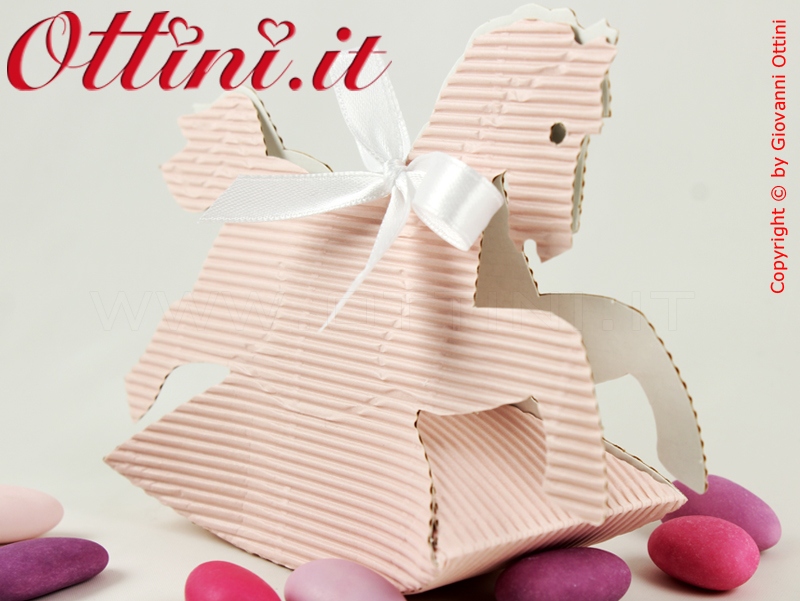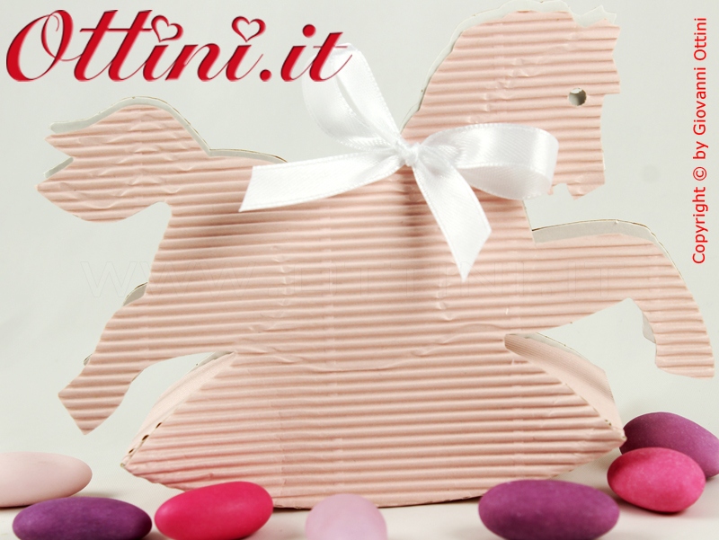 Scatolina porta confetti in cartoncino cannetè ondulato rosa a forma di cavallino. Aspetto vintage, molto sobrio. La struttura è consistente e robusta. Al suo interno potete inserire tutti confetti che desiderate, di qualsiasi tipo.