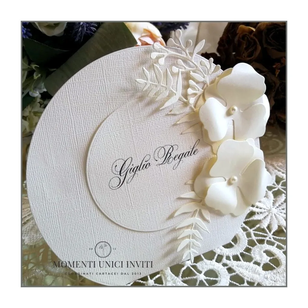 Il segnatavolo circolare della collezione luxury “Maria Vittoria” è perfetto per la mise en place di qualsiasi evento elegante e romantico: S.Battesimo, Prima Comunione, S. Cresima ma anche Matrimonio. Perfetti da abbinare alle partecipazioni della stessa linea con fiore 3D, come per esempio i modelli: Chloe e Isotta.