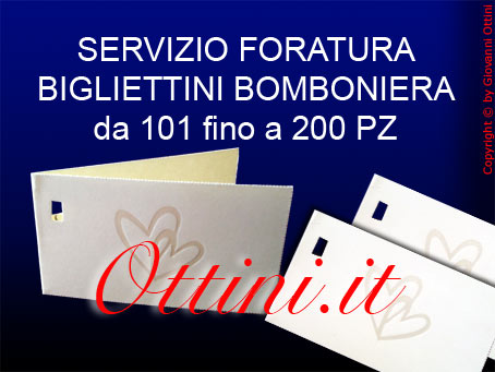 Servizio Foratura da 101 fino a 200 bigliettini bomboniera. Il foro è rettangolare (elegante e proporzionato nel contesto delle dimensione di un bigliettino bomboniera) di 2mm di larghezza per 4mm di altezza in modo da facilitare il passaggio del nastrino. Per la legatura consigliamo l’acquisto di nastrini di piccole dimensioni se doppio raso (3 e 6 mm sono ottimali) oppure fino a 20 mm se di organza (li confezioniamo tutti i giorni per cui è garantito l’ottimo risultato). Il servizio comprende la divisione, piegatura e foratura di tutti i biglietti bomboniera. ATTENZIONE: i bigliettini una volta forati NON potranno più essere stampati. E’ necessario quindi effettuare prima la stampa. Chi dovesse acquistarli senza stampa tenga presente che richiedendo la foratura non potrà più stamparli.