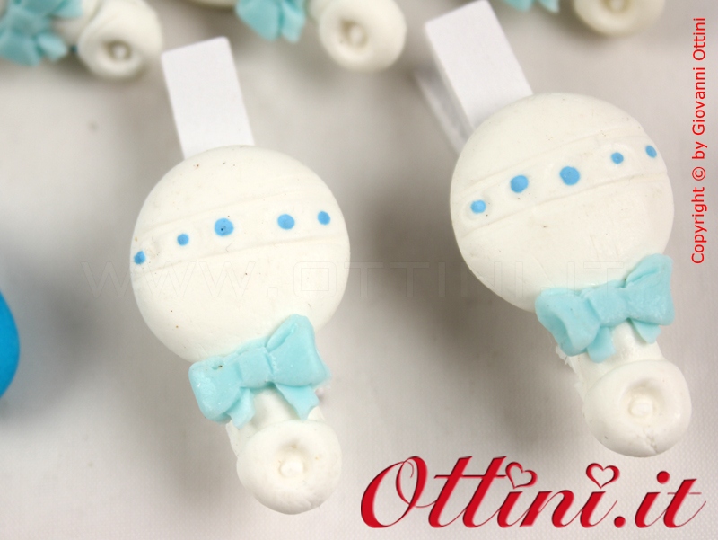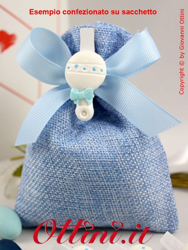 Mollettina bianca con applicazione di un decoro a sonaglio in resina colorata. Particolarmente indicato per la confezione di bomboniere per nascita o battesimo bimbo. Le confezioni sono di sei pezzi. Il prezzo che vedete è di una confezione intera.