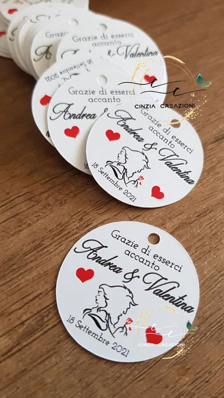 Queste tag possono essere utilizzate per decorare la confezione delle bomboniera, ma possono essere utilizzata anche come segnaposto, infatti potreste inserire del nastro o della corda nel buco e usarlo anche come lega tovagliolo per il ricevimento!