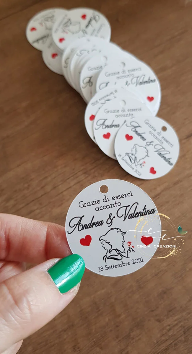 Tag matrimonio la bella e la bestia con grafica a tema, nomi degli sposi e data delle nozze stampati.