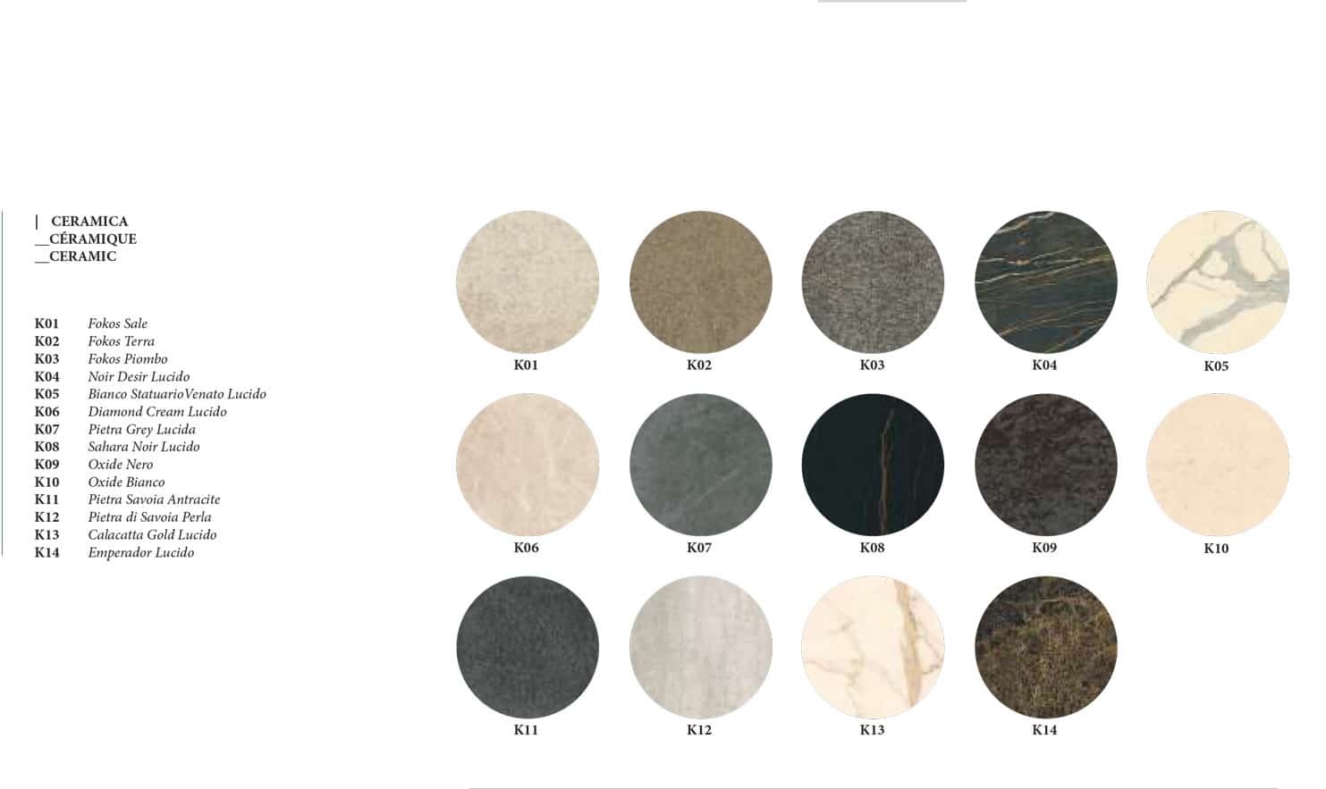 - Top Ceramica a scelta tra: K01 (Fokos Sale) – K02 (Fokos Terra) – K03 (Fokos Piombo) – K09 (Oxide Nero) – K10 (Oxide Bianco) – K11 (Pietra Savoia Antracite) – K12 (Pietra di Savoia Perla)
