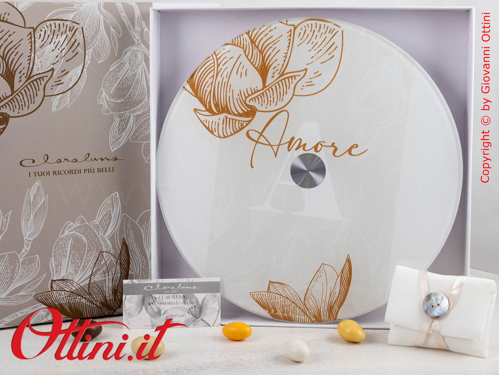 ATTENZIONE: le bomboniere come il Vassoio Girevole con scritta Amore – 25062 Claraluna vengono imballate con estrema cura da parte nostra. Tuttavia è possibile che durante il trasporto, il corriere possa danneggiarle per una infinita serie di ragioni. State tranquilli perché la merce viaggia assicurata e in caso di danno siamo qui per sostituire gratuitamente le rotture, ma dovete solo seguire una sola regola: al ricevimento, prestare attenzione all’incolumità del collo e opponete sempre “RISERVA DI CONTROLLO”, specificando eventualmente il danno (rumore di rottura, cartone schiacciato, ammaccato, ecc). L’autista è OBBLIGATO ad accettare la riserva. Se non opponete la Riserva, e dovessero risultare rotte, diventa problematico far valere l’assicurazione e procedere con la sostituzione.